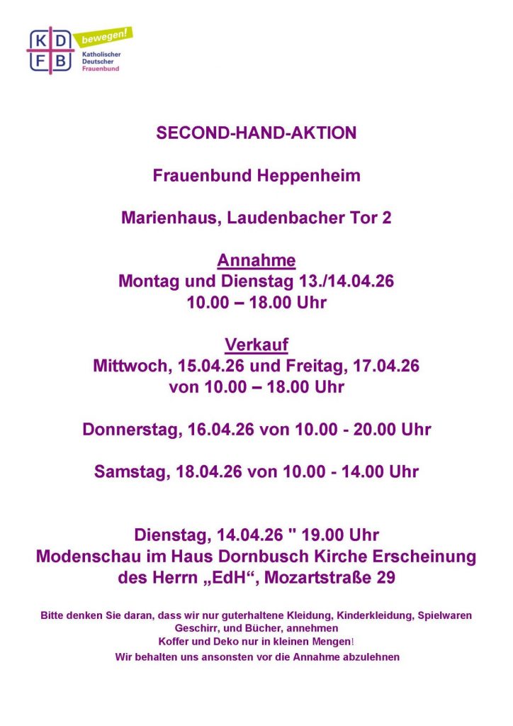 Zweigverein Heppenheim SECOND-HAND-AKTION vom Frauenbund Heppenheim Ort: Marienhaus, Laudenbacher Tor 2 in